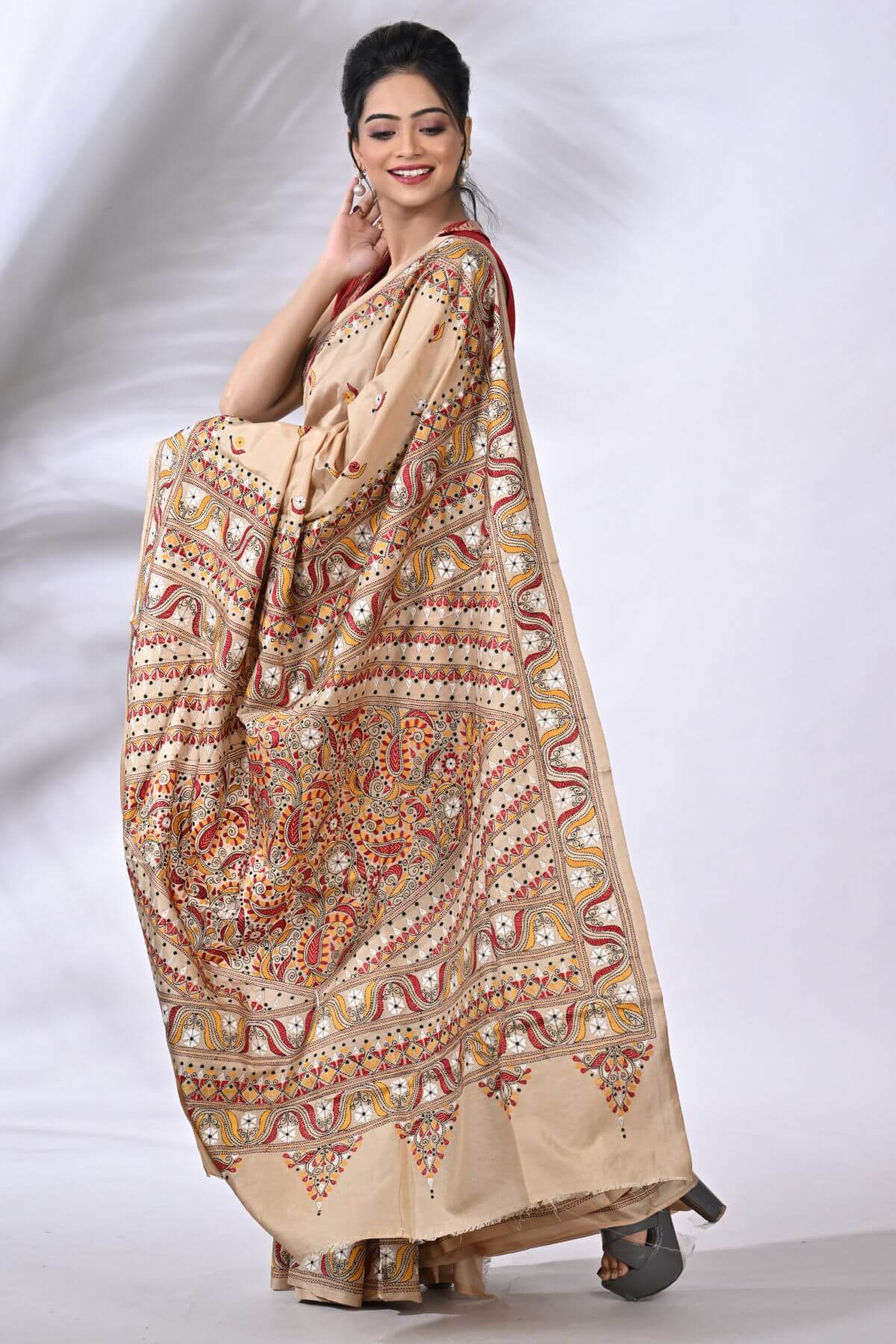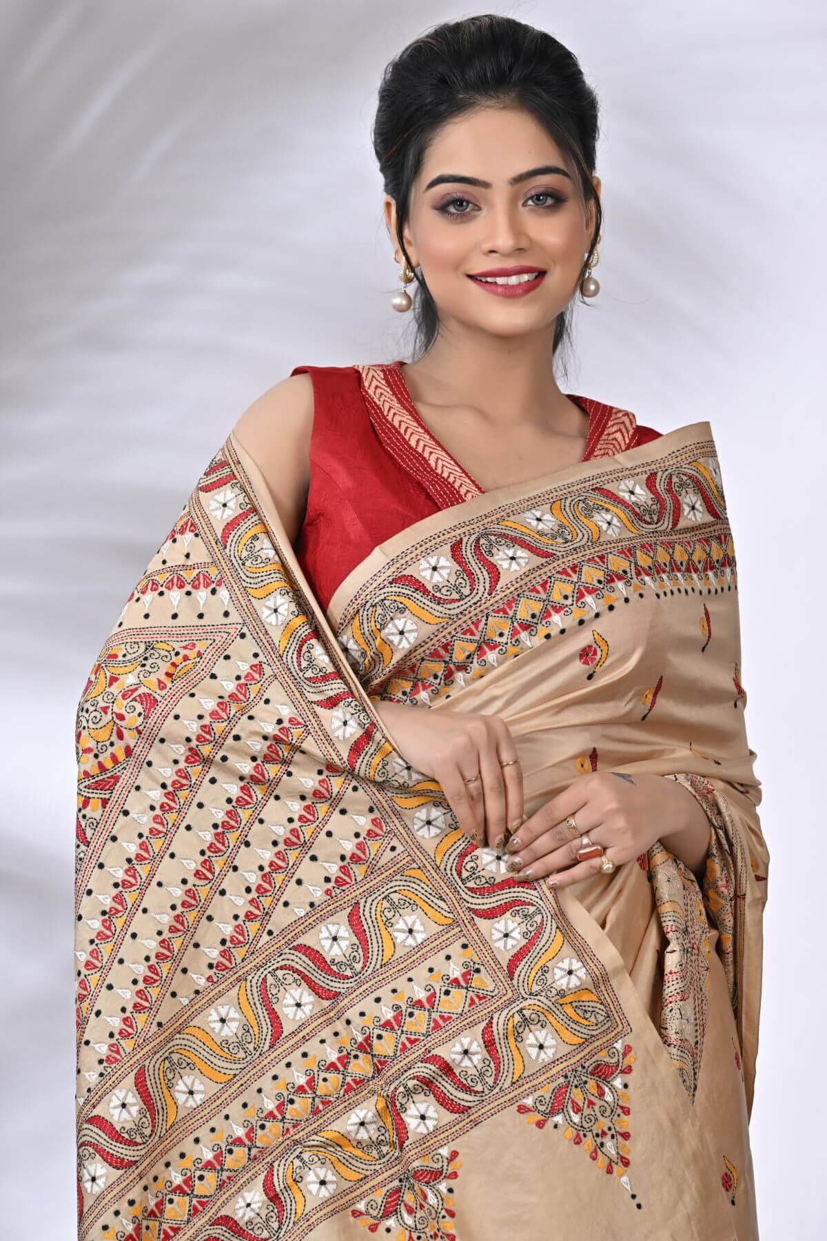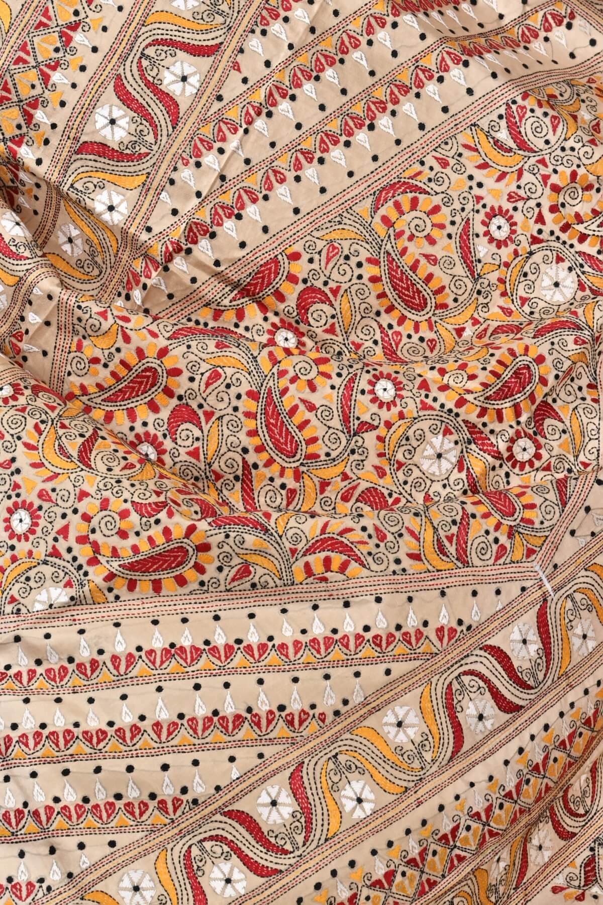 Beige Traditional Pure Gachi Tussar Kantha Saree