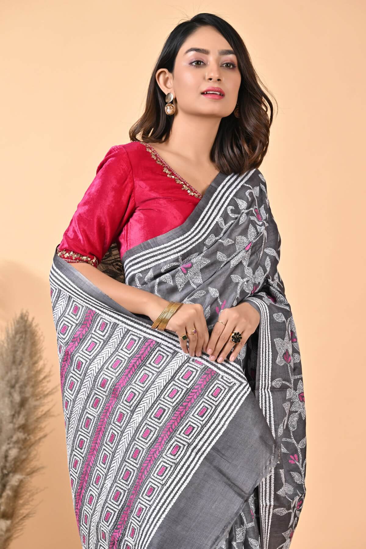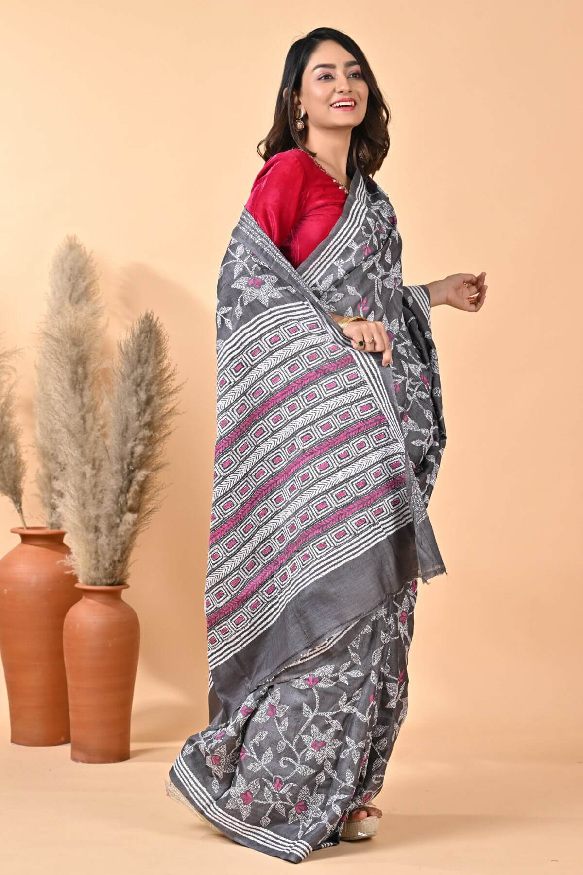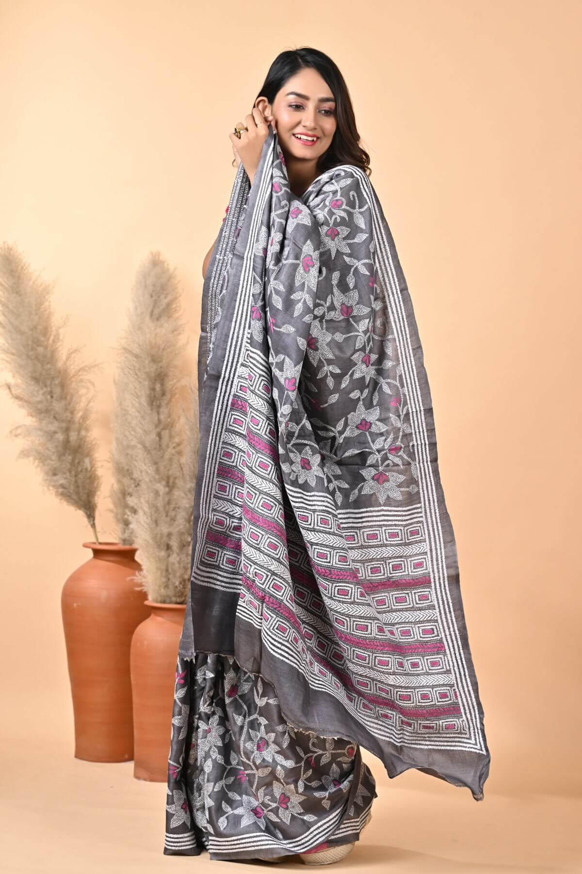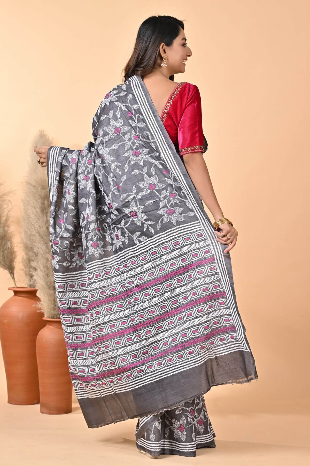 Black Floral Pure Gachi Tussar Kantha Saree