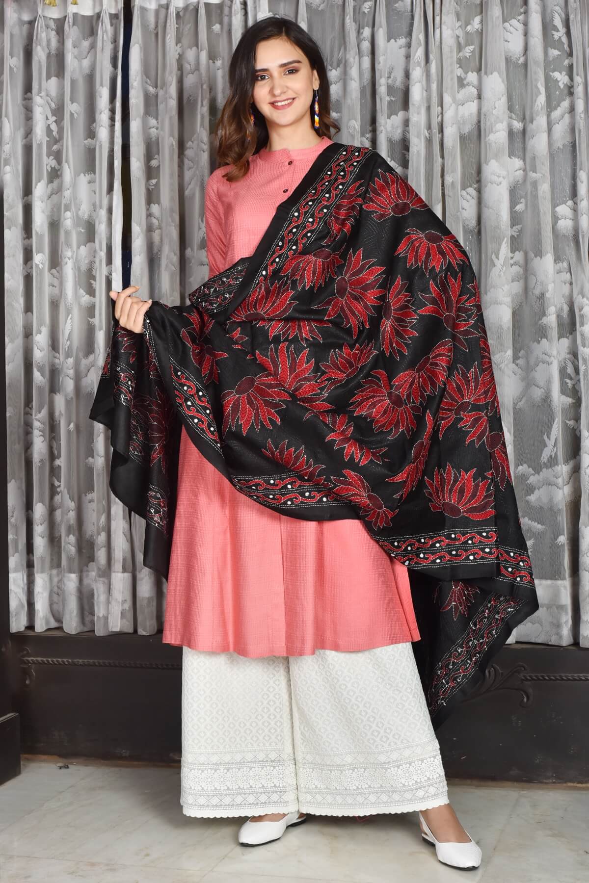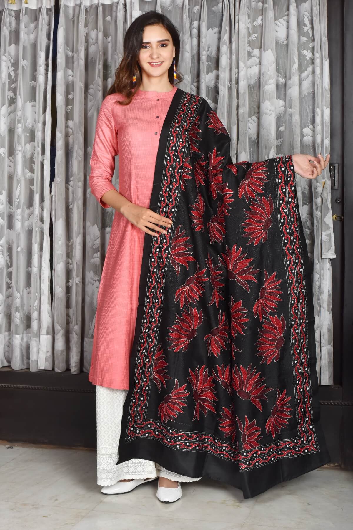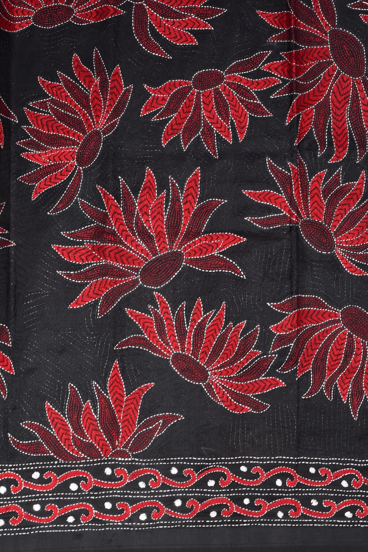 Black with Red Lotus Kantha Bangalore Silk Dupatta