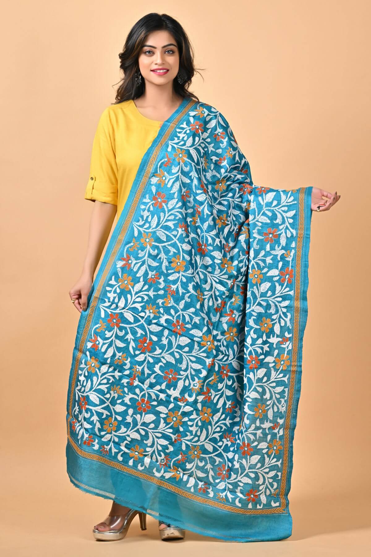 Blue Floral Pure Tussar Kantha Dupatta
