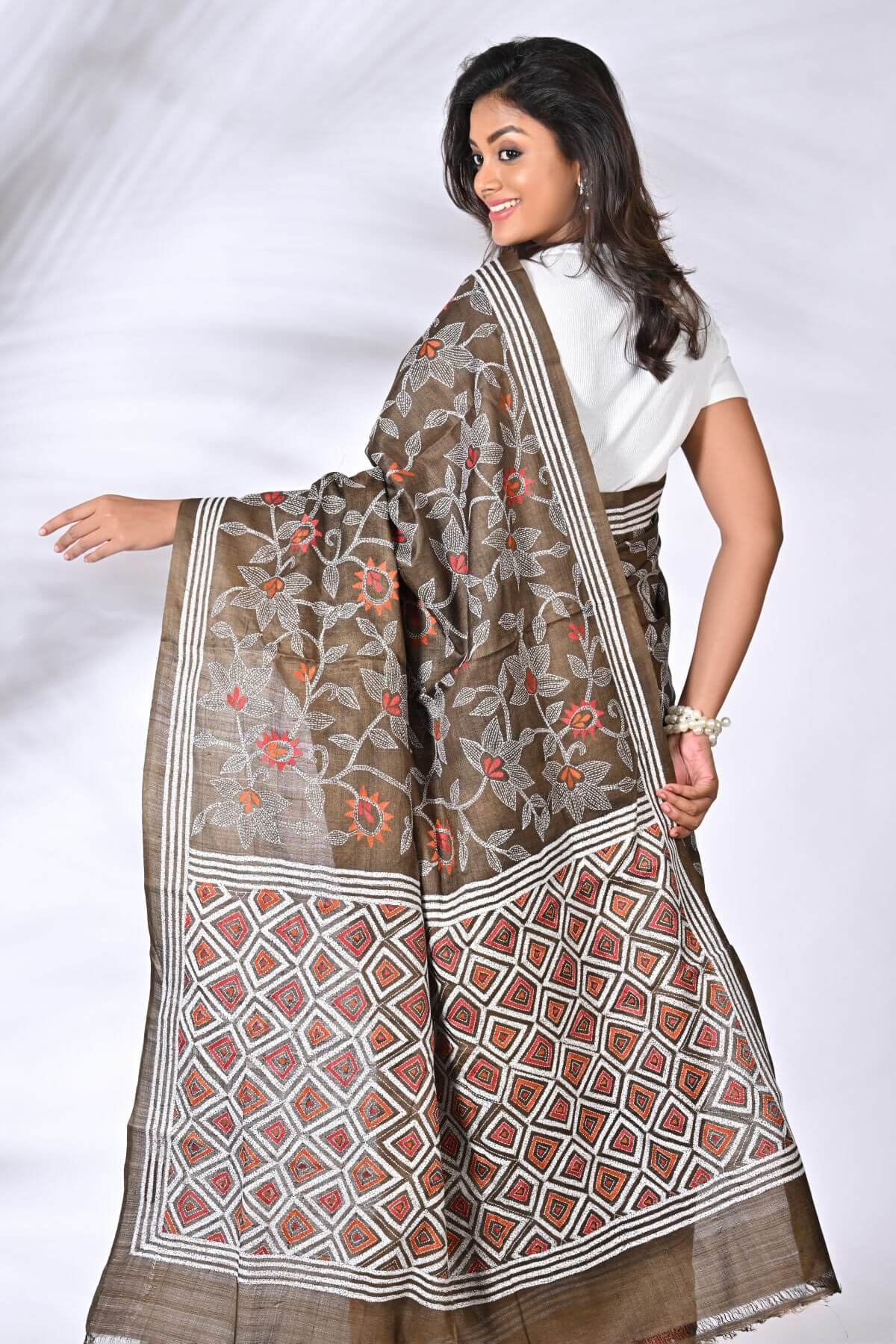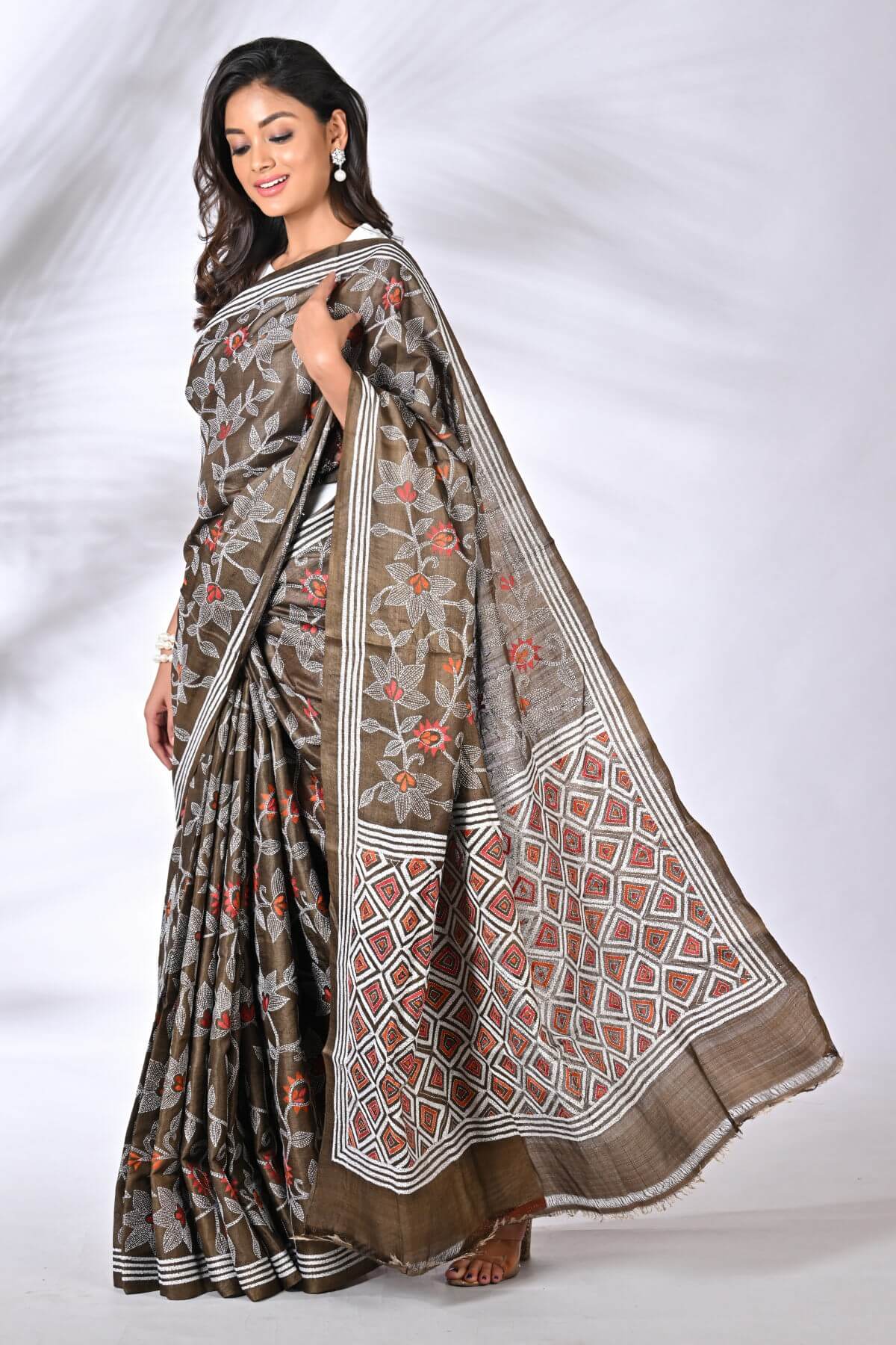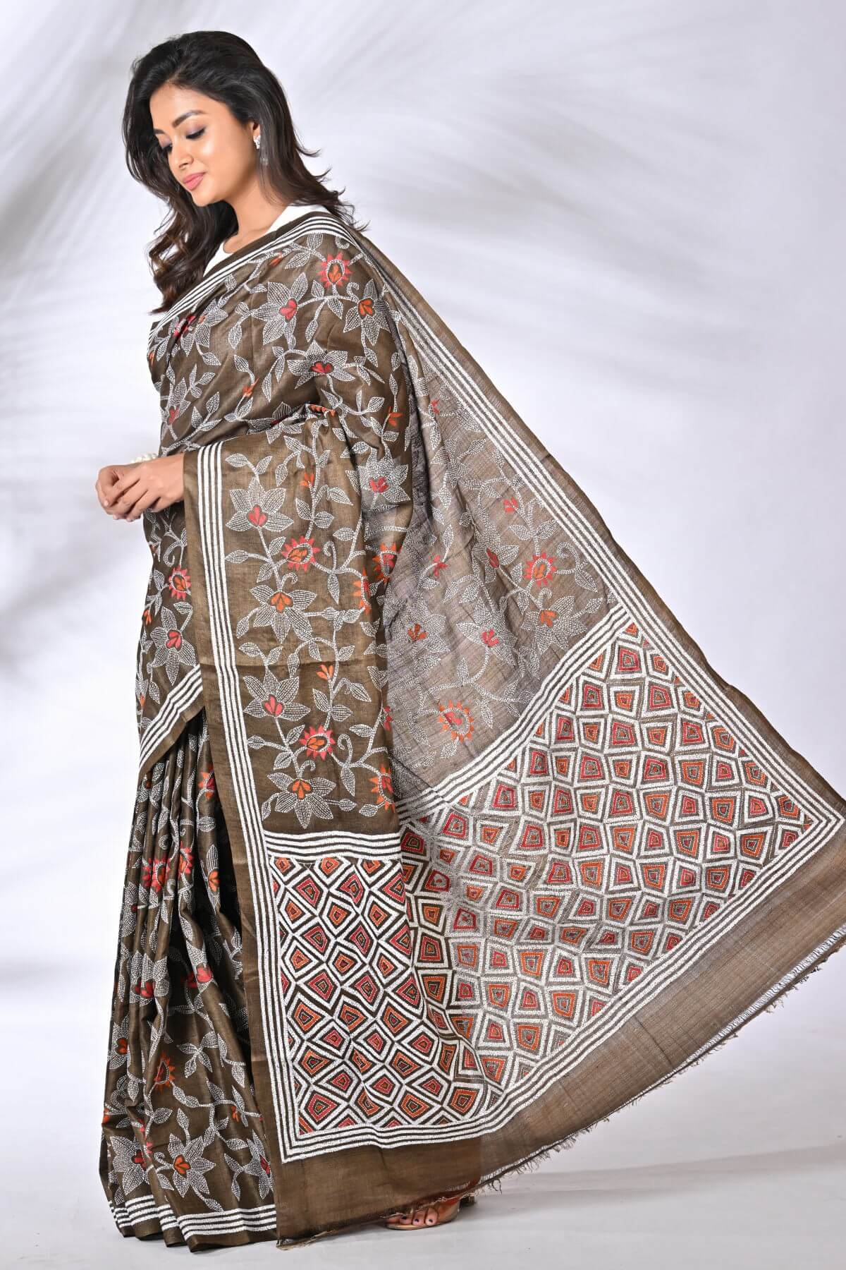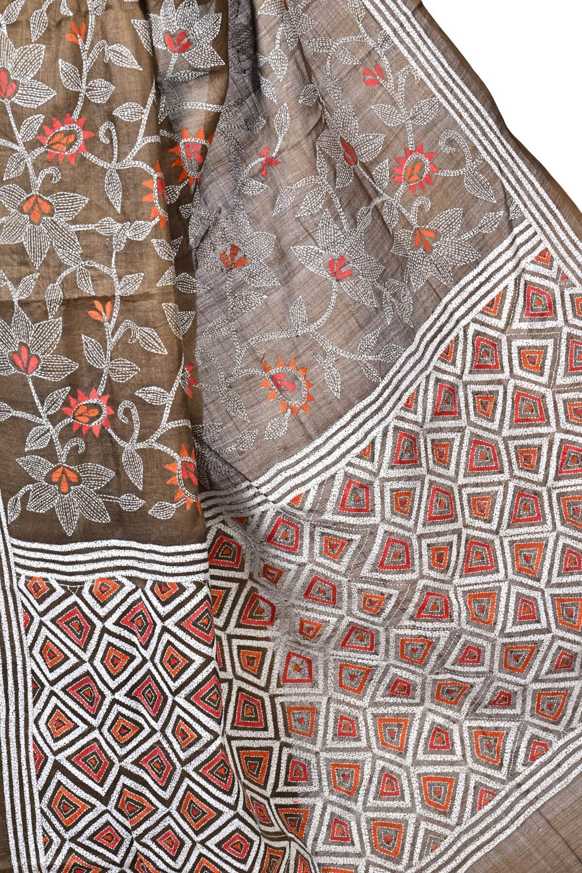 Coffee Brown Floral Pure Tussar Kantha Saree