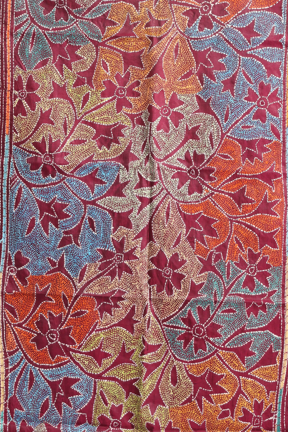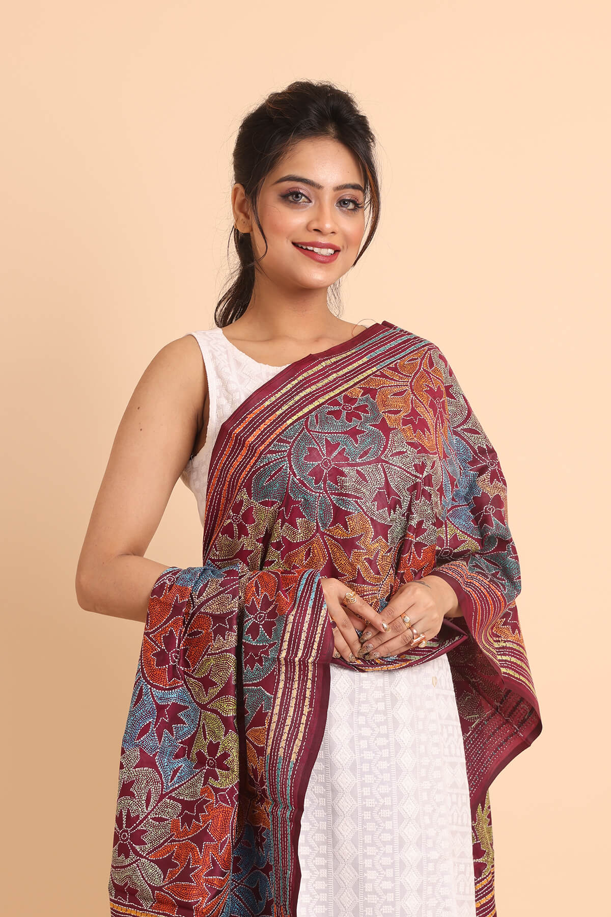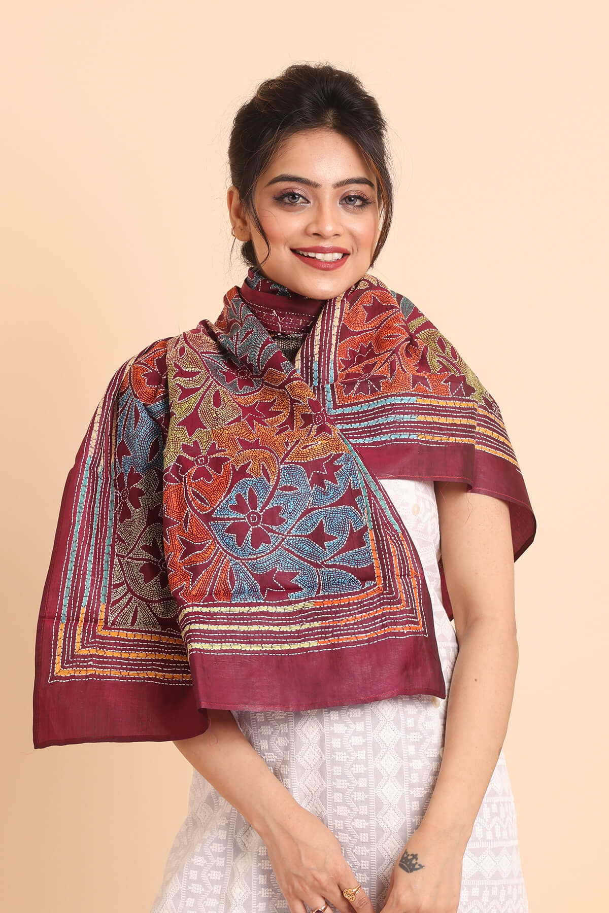 Maroon Floral Pure Silk Reverse Kantha Stole